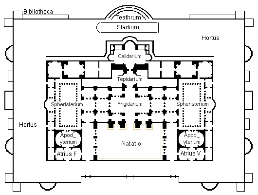 LA STRUTTURA DELLE TERME Le terme di Agrippa divennero il modello per tutte le altre, tanto che è possibile dire che i bagni generalmente si assomigliavano tutti tra loro, e questo perché la struttura era stata progettata appositamente per quello scopo e non era possibile cambiarne le sembianze senza creare problemi di tipo idraulico e ingegneristico, infatti i vari ambienti erano studiati in modo che quelli a maggiore temperatura stessero più vicini alle caldaie così come quelli più freddi stessero più lontani, ma non solo: l'intera struttura era orientata per fare si che gli ambienti più caldi ricevessero la luce del Sole da apposite finestre. Le terme sono generalmente degli edifici complessi formati da un corpo centrale fatto di laterizio e da un cortile/giardino che lo circonda chiuso a sua volta da un muro che ingloba altre strutture minori quali piccoli teatri, colonnati per passeggiare, terrazze pensili. Il corpo centrale è il cuore delle terme, esso è formato da una serie di locali a temperatura variabile che si snodano lungo un percorso circolare. Generalmente infatti per prima cosa ci si recava nel proprio reparto, poiché erano divisi per sesso, quindi nell'apodyterium o spogliatoio si lasciavano le proprie cose, vestiti, calzari, e oggetti vari, in apposite nicchie e ci si recava al calidarium, o prima allo spheristerium (palestra) per chi fosse interessato a fare esercizi ginnici. Nel calidarium, un ambiente molto caldo, era possibile fare esercizi e movimento per sudare, altrimenti ci si poteva spostare direttamente nel laconicum o sudatarium, una sorta di sauna, che era l'ambiente più riscaldato essendo posto a contatto con la caldaia (prefurnium) ed essendo circondato da pareti e pavimento cavi, secondo il sistema dell' ypocaustum, ove circolava aria calda. Si procedeva quindi nel tepidarium ove si effettuavano abluzioni con acqua tiepida e si attendeva l'abbassamento naturale della temperatura corporea; seguiva il frigidarium un locale con acqua fredda dove era possibile tonificare e rinvigorire il proprio corpo. Nella stessa area o in apposite stanze si effettuavano massaggi con oli ed essenze profumate, e si potevano trovare barbieri e acconciatrici (tensores) per la cura dei capelli e del viso. Volendo semplicemente divertirsi e schiamazzare, magari giocando con la palla, era possibile recarsi nella natatio o piscina scoperta. Naturalmente non era obbligatorio seguire questo ordine, ciascuno era libero di usare le vasche e gli ambienti che più gli aggradavano e nelle combinazioni che preferiva. Finite le cure del corpo si poteva tornare allo spogliatoio, rivestirsi e recarsi nelle piccole ma rifornite biblioteche per ascoltare qualche lettura, oppure passeggiare nel giardino (hortus) che circondava le terme magari sedendosi ad una panchina per ascoltare il canto degli uccellini. L'EFFETTO DELLE TERME Per i Romani le terme non erano solo un luogo in cui ci si lavava e si curava il corpo ma anche un luogo di socializzazione ove ci si incontrava con gli amici e si poteva passare del tempo libero, non necessariamente all'interno della vasche. Le terme in taluni casi potevano essere luoghi di acquisizione di cultura per le classi più basse, infatti come si è già detto si effettuavano letture pubbliche di testi e opere dell'epoca, la presenza di un teatro poteva permettere piccole rappresentazioni teatrali. Un'altro effetto importante era quello psicologico cioè di rilassare i Cittadini e di sciogliere le tensioni acquisite durante i giorni passati con il lavoro durante la vita quotidiana. Pensiamo per esempio se oggi gli Italiani potessero andare almeno una volta alla settimana in piscina e sguazzare liberamente, tutti sarebbero molto più rilassati ma anche più efficienti!