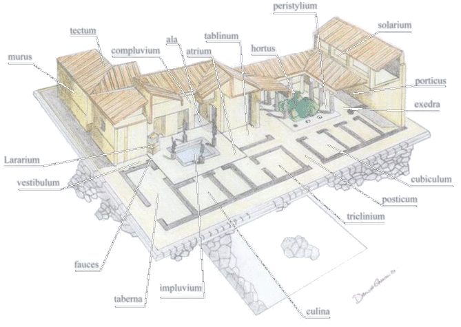 LA CASA ROMANA Nell'antica Roma, si affermano principalmente due tipi di case, la domus e la insula. DOMUS, LA CASA SIGNORILE. La domus, era la tipica casa signorile di città. Essa era strutturata generalmente su un piano e si estendeva in largo occupando talvolta un' intero quartiere. L'entrata si trovava generalmente su uno dei due lati più corti. Dall' entrata (fauces) si passava all' atrium, che era di forma quadrata al centro del quale c'era l'impluvium, una vasca per la raccolta dell'acqua piovana proveniente dall'apertura apposita nel tetto (cumpluvium). Attorno all'atrio c'erano alcune stanze adibite a vario uso, come la cucina (culina) ove su un apposito bancone di laterizio si preparavano le pietanze, cucinando in appositi piccoli forni o sopra a dei bracieri. Accanto all'atrio era sempre presente il lararium dove si tenevano le statue dei larii protettori della casa, della famiglia e di altre divinità. In fondo all'atrio solitamente si trovava il tablinum, ossia una stanza nella quale si ricevevano gli ospiti, la quale era affacciata con un lato sul peristilium cioè un giardino circondato da un colonnato sotto il qual c'erano le porte che davano alle camere da letto (cubicula), ed al triclinium ossia la sala da pranzo. In quest'ultima erano presenti dei letti sui quali si mangiava distesi attingendo il cibo che era posato nei piatti su un tavolo centrale. Talvolta alcune domus avevano anche piccole fontane o statue al centro del giardino, e possedevano un altro peristilium adibito a piccolo orto/giardino attorno al quale si sviluppavano stanze private. Da notare è che tutte le finestre erano rivolte verso l'interno della casa. La domus possedeva inoltre una seconda uscita di servizio detta posticum sul retro per permettere il passaggio della servitù e dei rifornimenti senza ingombrare l'ingresso principale. Esistevano inoltre le case di campagna per il riposo (ad otium), chiamate villa urbana se erano nei pressi della città, e villa suburbana se lontane dalla città, e mantenevano anche se talvolta in piccolo la stessa struttura delle domus cittadine. Queste non sono da confondere con le villae rusticae, vere e proprie case coloniche, anche se talvolta le villae potevano essere destinate contemporaneamente all'otium ed alla produzione agricola e/o all'allevamento di animali. La domus, sebbene fosse la casa dei ricchi, non aveva una grande quantità di mobilio, infatti esso era ridotto all'essenziale, e lo splendore della casa quindi si notava principalmente dalla qualità di marmi, statue, e affreschi parietali. Da ricordare comunque sono le sedie, delle quali conosciamo molti tipi, come la sella o seggiola senza schienale, la sedia con schienale e braccioli (cathedra), la sedia con un sedile lungo (longa), ed il triclinium, o lettino per mangiare distesi. Tra il mobilio troviamo sopratutto gli armadi (armarium), ed i letti (cubicula).